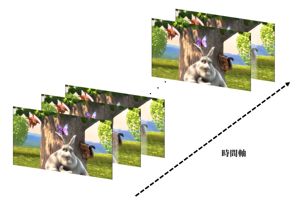 動画ファイルは何枚もの画像が連なっている。ちなみに映像はオープンソース動画として、様々なところで使われている「Big Buck Bunny」。